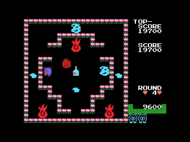 Guzzler is a maze game where the player controls a creature who can drink (or guzzle) water from puddles, then extinguish fires and monsters spawned from those fires. Each level is a single-screen maze.